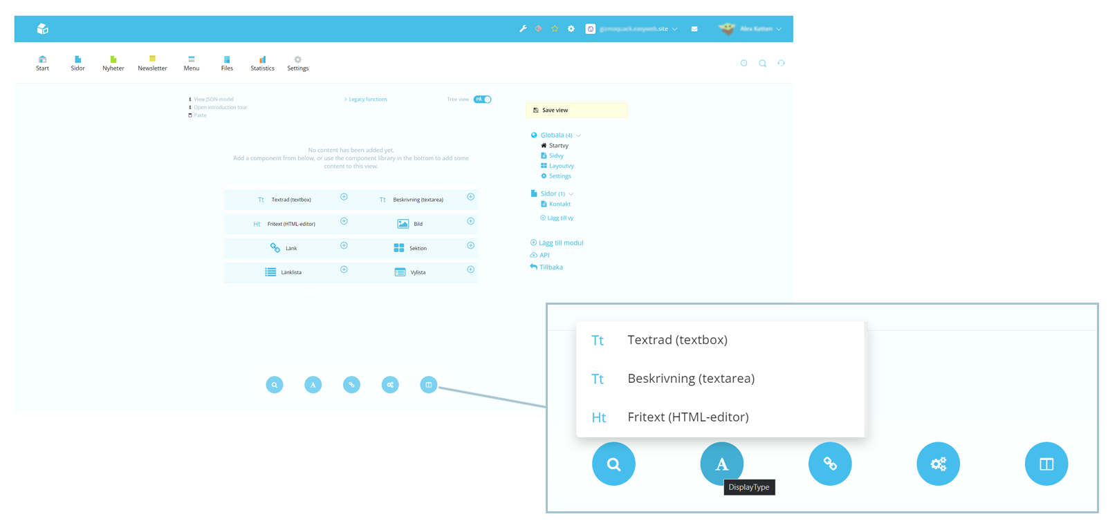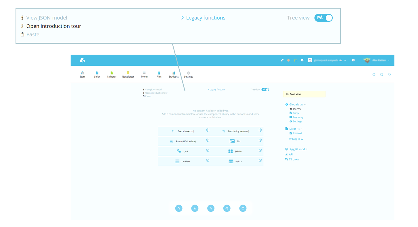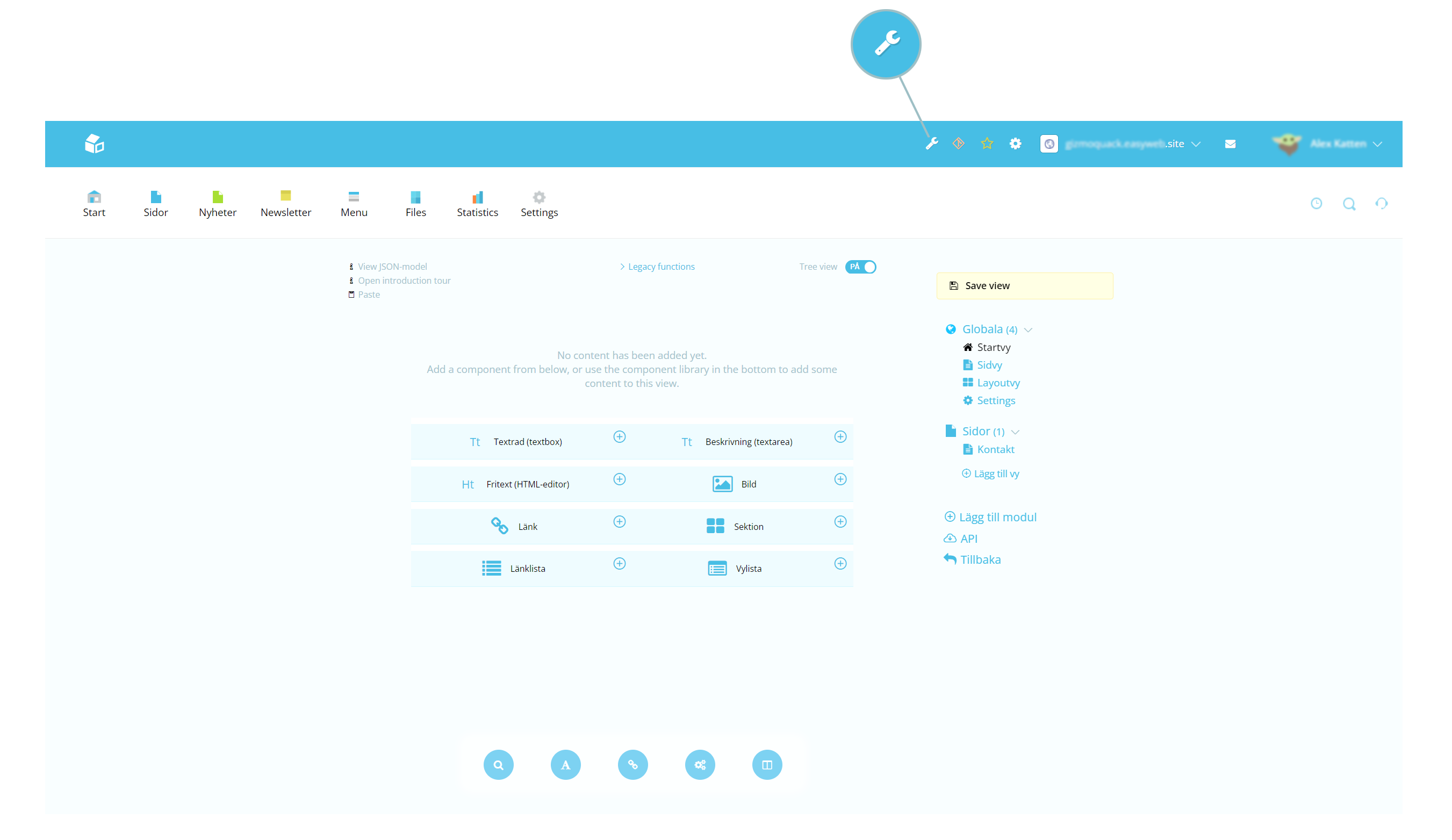 This is an overview of the studio. It's composed of a main/middle section, a right column and a menu in the bottom. Read more about each section below.