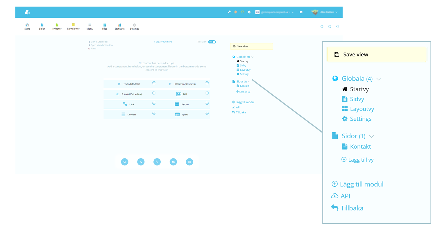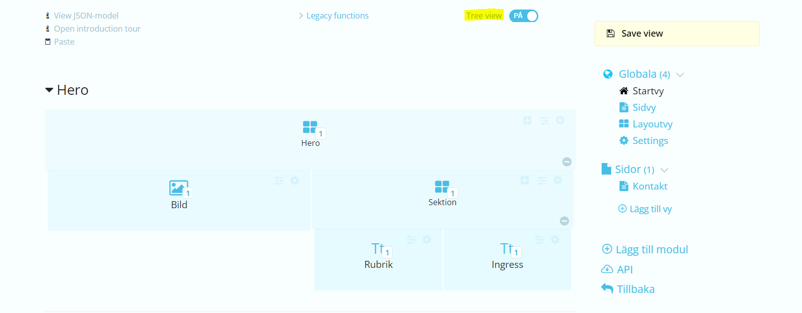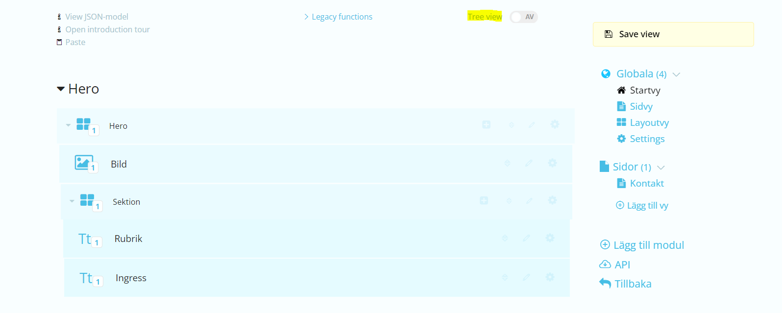 The column to the right lists all the views and modules. Here you can add or edit existing modules.
